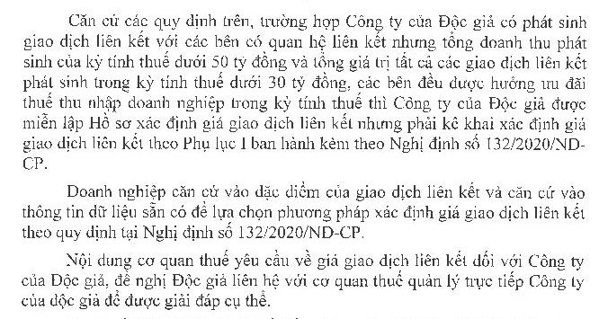 Doanh nghiệp tôi (doanh nghiệp A) là đối tượng doanh nghiệp liên kết với doanh nghiệp khác (doanh nghiệp B). Cả hai doanh nghiệp đều đang hưởng ưu đãi thuế thu nhập doanh nghiệp với các sản phẩm sản xuất ra, có phát sinh giao dịch liên kết nhưng tổng doanh thu phát sinh của kỳ tính thuế dưới 50 tỷ đồng và tổng giá trị tất cả các giao dịch liên kết phát sinh trong kỳ tính thuế dưới 30 tỷ đồng; Cả hai doanh nghiệp đều kê khai xác định giá giao dịch liên kết theo mẫu số 1 của phụ lục và được miễn lập hồ sơ.