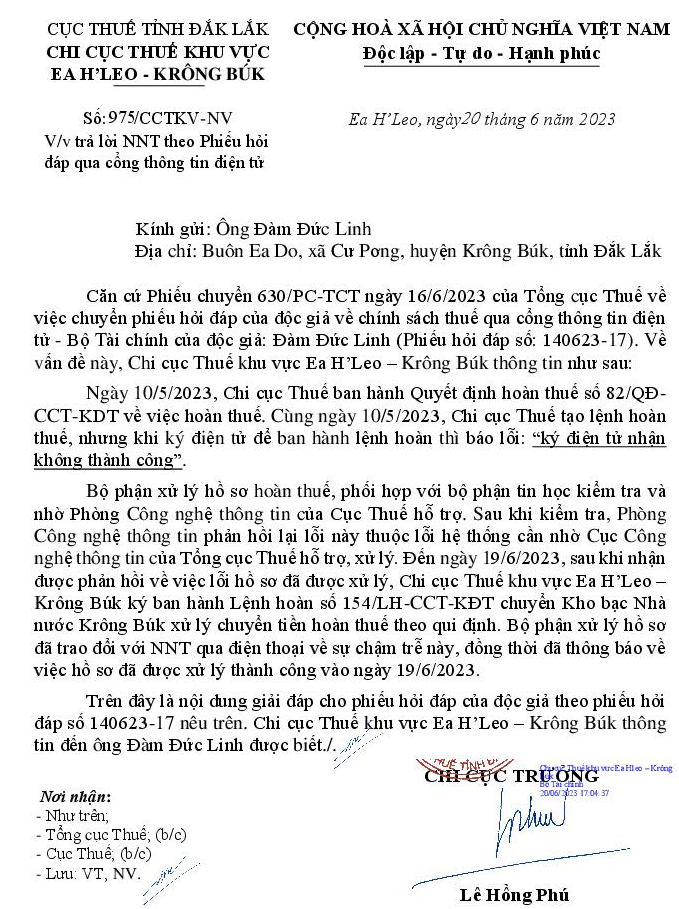 Kính gửi Quý anh chị phụ trách Tôi tên là Đàm Đức Linh, MST là 8348961261 có làm hồ sơ quyết toán Thuế TNCN kỳ hoàn 2022 theo quyết định hoàn thuế số 82/QĐ-CCT-KDT ngày 10/05/2023. (Quyết định được tôi gửi kèm email này). Tuy nhiên đến nay đã hơn 30 ngày tôi vẫn chưa nhận được tiền hoàn thuế, tôi có liên hệ với chị Mai là Cán bộ phụ trách hồ sơ của tôi thì được giải thích là bị lỗi về chữ ký số. Và lỗi này cần Bộ phận Công nghệ Thông tin của Cục thuế VN giải quyết. Tôi rất muốn biết lỗi hệ thống này khi nào sẽ xử lý xong?. Kính mong được Cục thuế xem xét và hỗ trợ giải quyết. Xin chân thành cảm ơn.