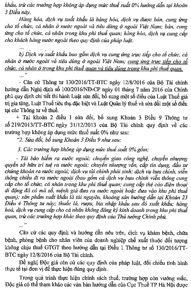 Kính gửi Bộ Tài Chính. Công ty chúng tôi là công ty thực hiện dịch vụ khám- chữa bệnh (mảng lĩnh vực y tế) thành lập năm 2021 do sở kế hoạch đầu tư cấp phép, trụ sở đặt tại Quận Hà Đông- hà Nội. Hiện tại, công ty chúng tôi cung cấp dịch vụ khám bệnh cho các công ty thuộc các lĩnh vực khác nhau trong đó có công ty khu chế xuất. Theo luật thuế, Lĩnh vực y tế (cụ thể khám chữa bệnh) là lĩnh vực áp dụng không chịu thuế GTGT. Tuy nhiên, có công ty bên khu chế xuất mà chúng tôi thực hiện có yêu cầu chúng tôi xuất hóa đơn 0%. Vậy xin hỏi bộ tài chính chúng tôi xuất hóa đơn 0% có đúng không?. Chúng tôi đã hỏi công văn lên chi cục thuế quận Hà Đông được hướng dẫn vẫn thực hiện đúng theo luật hướng dẫn với lĩnh vực hoạt động y tế là "Không chịu thuế". Bên khách hàng có hỏi Cục thuế Hưng Yên và yêu cầu công ty chúng tôi xuất 0% và có trả lời hiện chi cục Hưng Yên đang to hơn chi cục thuế quận nên áp dụng với đơn vị có thẩm quyền cao hơn. Kính mong quý Bộ quan tâm hướng dẫn để công ty chúng tôi thực hành, chấp hành đúng luật. Trân trọng cảm ơn!.