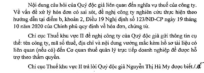 Kính gửi Bộ Tài Chính, Lời đầu tiên, tôi xin gửi đến Bộ Tài Chính/ Tổng Cục Thuế lời chào và lời chúc tốt đẹp nhất. Xin kính nhờ Bộ Tài Chính giải đáp và hướng dẫn giúp tôi về vướng mắc sau đây: Công ty chúng tôi phát sinh nghiệp vụ kinh tế và có tiến hành lập hóa đơn cho Khách hàng vào ngày 10/03/2025. Hóa đơn đã được cấp mã của Cơ quan Thuế và gửi cho Khách hàng. Đến ngày 14/03/2025, Khách hàng phát hiện hóa đơn sai sót do thiếu 1 đồng tiền thuế GTGT, do thỏa thuận hai bên không đồng ý với việc lập hóa đơn điều chỉnh, nên Công ty chúng tôi tiến hành xử lý hóa đơn sai sót theo căn cứ điểm b khoản 2 Điều 19 Nghị định số 123/2020/NĐ-CP ngày 19/10/2020 bằng cách lập hóa đơn điện tử mới, thay thế cho hóa đơn điện tử đã sai sót. Hóa đơn điện tử mới thay thế cho hóa đơn sai sót có dòng “Thay thế cho hóa đơn số…, mẫu số…, ký hiệu…, ngày…”. Đồng thời, lập Biên bản hủy hóa đơn sai sót và Thông báo sai sót mẫu số: 04/SS-HĐĐT gửi CQT và được tiếp nhận. Nhưng Khách hàng không đồng ý việc Hủy hóa đơn sai sót và lập hóa đơn mới thay thế hóa đơn sai sót như nêu trên, yêu cầu công ty chúng tôi hủy hóa đơn sai sót, lập hóa đơn mới không có dòng chữ: “Thay thế cho hóa đơn số…, mẫu số…, ký hiệu…, ngày…”. Trong khi đó, dịch vụ theo nội dung hóa đơn chưa chấm dứt và vẫn còn đang được cung cấp dịch vụ. Kính nhờ Bộ Tài Chính/ Tổng Cục Thuế giải đáp và hướng dẫn Công ty chúng tôi về việc xử lý hóa đơn sai sót như nêu trên, với cách làm của Công ty chúng tôi là đúng hay sai? Có thể làm theo cách làm của Công ty khách hàng được hay không? Tôi xin trân trọng cảm ơn!