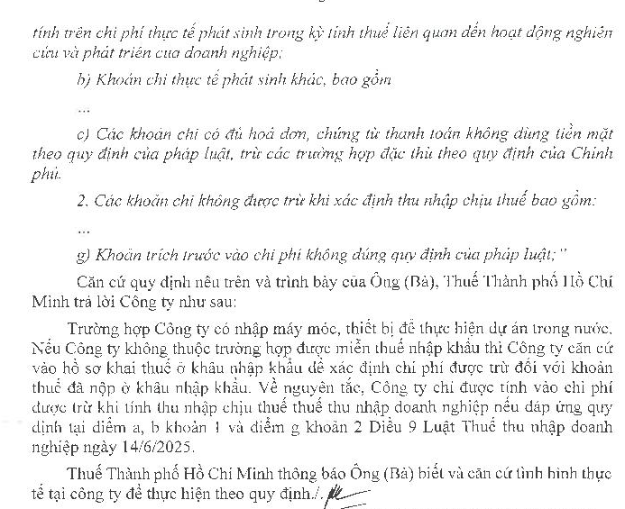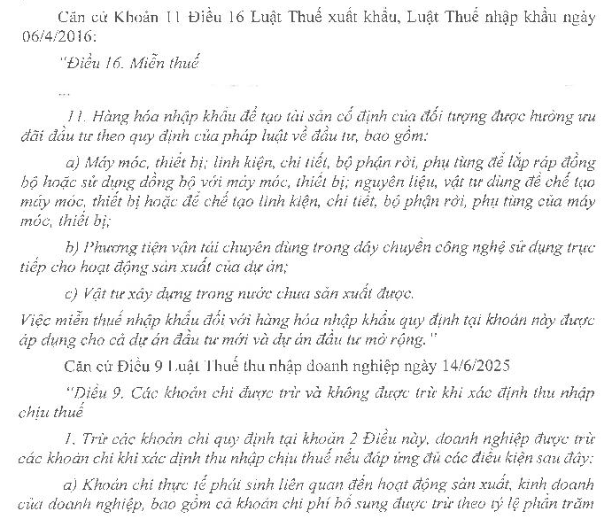 Tên Công ty : CÔNG TY CP ĐTXD TRUNG NAM Địa chỉ : 7A/68 Thành Thái, P14, Q10 Mã số thuế : 0303543710 Lời đầu tiên, thay mặt cho toàn thể CBCNV, xin gửi lời cảm ơn đến Quý cơ quan đã hỗ trợ và giúp đỡ chúng tôi trong quá trình hoạt động kinh doanh của doanh nghiệp. Căn cứ vào tình hình hoạt động kinh doanh đầu tư của Công ty chúng tôi thời gian đến, Công ty cũng đã nghiên cứu tìm hiểu các quy định của pháp luật về việc đầu tư hình thành tài sản đảm bảo chi phí hợp lý của doanh nghiệp, nhưng có quy định rõ ràng về nội dung này, nên Công ty chúng tôi xin được gửi câu hỏi tới Tổng Cục Thuế Chi về nội dung cụ thể như sau: Về Giá mua nhập khẩu thiết bị: 1> Chủ đầu tư: Đầu tư dự án nhà máy điện - Theo quy hoạch của Bộ công thương 2> Pháp lý dự án: Chưa có phê duyệt pháp lý đầu tư 3> Nhà thầu thi công: Nhập khẩu trước hàng hóa về để dự phòng thi công và đảm bảo năng lực thi công. 4> Giá mua thiết bị nhập khẩu: 4.1 > Chưa có phê duyệt pháp lý dự án: theo quy định không được miễn thuế nhập khẩu. (Công ty chúng tôi đang rơi vào trường hợp này) 4.2 > Nếu đã có phê duyệt pháp lý dự án: Thì một số thiết bị theo quy định sẽ được miễn thuế nhập khẩu. Như vậy Công ty chung tôi xin hỏi khi có đầu đủ pháp lý dự án và triển khai thi công thì nhà thầu thi công sử dụng thiết bị đã mua trước khi có phê duyệt pháp lý (mục 4.1) thì chi phí liên quan đến khoản thuế nhập khẩu trên có được xem là chi phí hợp lý của doanh nghiệp chủ đầu tư dự án không? Kính mong Quý cơ quan thuế xem xét hỗ trợ doanh nghiệp hướng dẫn hạch toán chi phí này. Trân trọng cảm ơn!