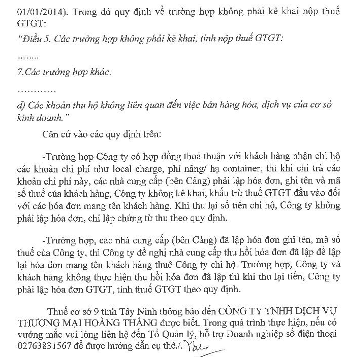 Xin hướng dẫn về việc phát hành hóa đơn trong hoạt động thanh toán hộ liên quan dịch vụ xuất nhập khẩu : Kính gửi Quý Bộ Tài Chính, Công ty chúng tôi hoạt động trong lĩnh vực dịch vụ xuất nhập khẩu, gồm: mở tờ khai, làm thủ tục hải quan, vận chuyển hàng hóa và các dịch vụ liên quan. Trong quá trình hoạt động, các khoản phí như local charge và phí nâng/hạ container thường phát sinh ngoài giờ hành chính, đặc biệt là vào buổi đêm. Khi đó, tài xế đến lấy/hạ container và phải thanh toán ngay để thực hiện thủ tục lấy hàng, nhằm đảm bảo tiến độ vận chuyển. Tuy nhiên, theo quy định tại Luật thuế giá trị gia tăng số 48/2024/QH15, các khoản thanh toán bắt buộc phải thực hiện bằng hình thức không dùng tiền mặt và có chứng từ hợp lệ. Do đó, tôi xin hỏi Bộ Tài Chính về giải pháp hợp lệ cho các trường hợp sau: Cụ thể: - Bên khách hàng có hợp đồng với bên Công ty chúng tôi và ủy quyền cho bên Công ty chúng tôi thanh toán hộ các chi phí phát sinh như trên bằng chuyển khoản từ tài khoản Công ty, sau đó Bên Công ty chúng tôi có ký hợp đồng nguyên tắt với bên nhà xe vận chuyển và ủy quyền lại nhà xe thanh toán hộ các chi phí này , sau đó nhà xe ủy quyền cho tài xế/ nhân viên bên nhà xe bằng chuyển khoản từ tài khoản công ty/ hoặc cá nhân cho tài xế, sau đó các tài xế khi lấy/hạ Container sẽ thanh toán các phí nâng hạ container cho bên Cảng bằng tài khoản cá nhân , tôi muốn hỏi : + Là bên Nhà xe cũng phải Chuyển khoản cho tài xế/nhân viên của mình từ Tài khoản Công ty họ qua tài khoản cá nhân tài xế/ nhân viên phải không ? + Khi Cảng ra hóa đơn : Là cảng vẫn xuất hóa đơn thẳng cho Khách hàng của chúng tôi luôn thì được không ? hay phải xuất hóa đơn cho nhà xe rồi nhà xe xuất lại cho bên Công ty chúng tôi, sau đó Công ty chúng tôi phải xuất hóa đơn lại cho Khách hàng ? và khi xuất hóa đơn thì chi phí từ lúc Cảng phát hành hóa đơn ví dụ 700.000vnđ ( chưa VAT) thì cuối cùng Công ty chúng tôi phải xuất lại cho khách hàng của mình cũng là 700.000vnđ ( chưa VAT) phải không ? Kính mong Quý Bộ hướng dẫn rõ về cách phát hành hóa đơn, chứng từ hợp lệ trong trường hợp cụ thể của công ty chúng tôi, nhằm đảm bảo tuân thủ quy định của pháp luật về thuế và chứng từ kế toán. Xin chân thành cảm ơn Quý Bộ đã quan tâm, hỗ trợ.