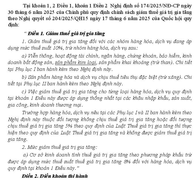 Tuy nhiên, tại Khoản 1 Điều 1 Nghị quyết số 204/2025/QH15 và Điểm a, Khoản 1, Điều 1 Nghị định số 174/2025/NĐ-CP có quy định loại trừ một số nhóm ngành khỏi đối tượng giảm thuế, trong đó bao gồm: