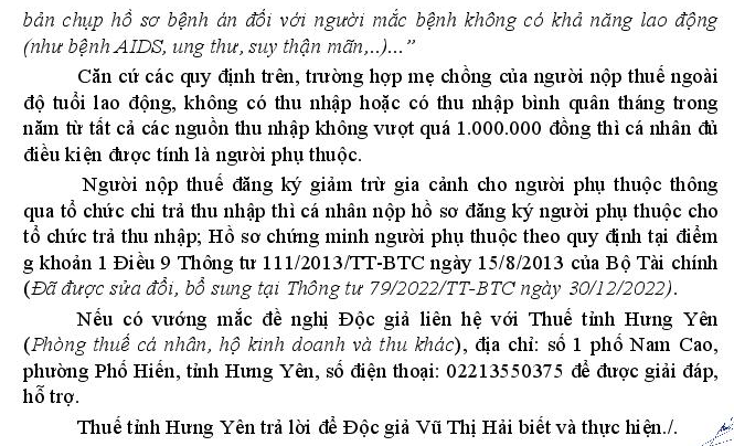 Tôi đang sống chung với bố mẹ chồng (mẹ chồng tôi sinh năm 11/1968), tính đến hết tháng 7/2025 là đủ tuổi về hưu, đủ điều kiện làm giảm trừ theo quy định. Mẹ chồng tôi không có lương hưu, ở nhà trông cháu.
