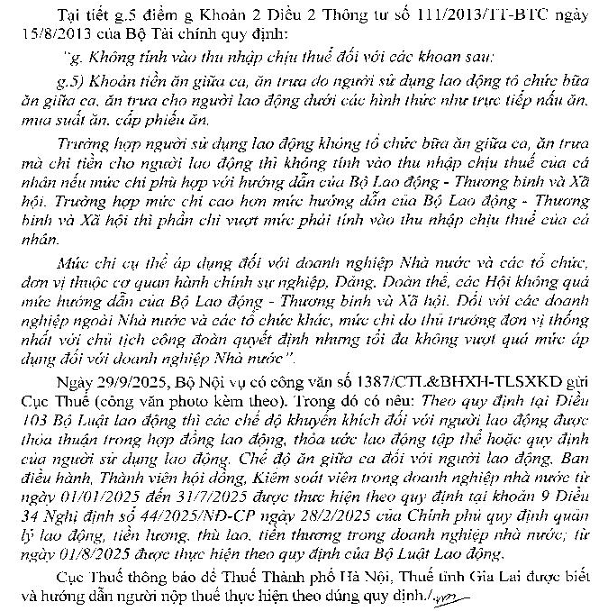Kính gửi Bộ Tài Chính, Liên quan tới khoản phụ cấp ăn giữa ca. Căn cứ theo: Thông tư số 111/2013/TT-BTC tại điểm g.5 khoản 2 Điều 2, và Nghị định 44/2025/NĐ-CP và Thông tư 003/2025/TT-BNV. Hiện nay, Thông tư 03/2025/TT-BNV đã bãi bỏ mức trần 730.000 đồng/người/tháng trước đây, nhưng chưa có hướng dẫn cụ thể từ Bộ tài chính/cơ quan thuế về quy định mới này, dẫn đến việc doanh nghiệp gặp khó khăn trong xác định tính chất miễn thuế đối với khoản tiền ăn giữa ca là được miễn thuế trong toàn bộ, hay chỉ trong một giới hạn nhất định. Theo đó, doanh nghiệp hiểu như sau: a. Khoản chi tiền ăn giữa ca vẫn được miễn thuế nếu đáp ứng điều kiện “phù hợp với hướng dẫn của Bộ LĐ-TBXH” như quy định tại Thông tư 111, dù hiện nay không còn mức trần cụ thể. b. Hiện Doanh nghiệp đang chi 1.000.000 đồng/người/tháng, có quy định trong quy chế lương và phân bổ theo ngày công thực tế trên bảng lương. Theo cách hiểu của doanh nghiệp, khoản chi này vẫn được miễn thuế TNCN với mức 730.000 đồng/người/tháng. Kính đề nghị Quý cơ quan xác nhận cách hiểu trên của doanh nghiệp đã đúng hay chưa? Doanh nghiệp luôn thực hiện đầy đủ nghĩa vụ thuế và kê khai đúng quy định đối với các khoản thu nhập chịu thuế của người lao động, trừ các khoản được miễn thuế theo quy định của pháp luật. Trong đó, khoản tiền ăn giữa ca đã được chi trả và kê khai thuế đúng định mức, đúng theo hướng dẫn tại thời điểm phát sinh. Trong trường hợp khoản chi tiền ăn giữa ca bị chuyển hoàn toàn thành thu nhập chịu thuế, thu nhập thực nhận của người lao động sẽ bị giảm. Tác động này không chỉ ảnh hưởng đến người lao động có thu nhập trung bình – thấp, mà ngay cả những lao động có thu nhập cao cũng sẽ chịu mức thuế TNCN tăng rõ rệt do áp dụng biểu thuế lũy tiến từng phần. Điều này ảnh hưởng đến chính sách đãi ngộ và khả năng duy trì nguồn nhân lực ổn định, đặc biệt trong bối cảnh thị trường lao động cạnh tranh như hiện nay. Rất mong Quý Cơ quan có văn bản hướng dẫn chính thức để doanh nghiệp thực hiện đúng quy định pháp luật, đồng thời giảm thiểu rủi ro trong quá trình kê khai và quyết toán thuế. Rất mong được sự Hướng dẫn chi tiết của Bộ Tài chính, xin chân thành cảm ơn!