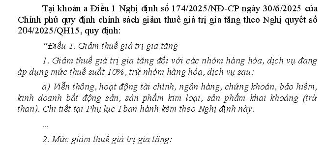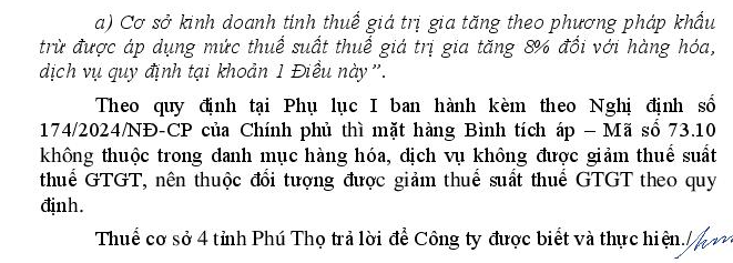 CÔNG TY TNHH TMDV THIẾT BỊ THẮNG LINH; Mã số thuế: 2601094408; Địa chỉ trụ sở chính: Khu 7, xã Vạn Xuân, Tỉnh Phú Thọ. Liên quan đển việc giảm thuế GTGT căn cứ Nghị định 174/2025/NĐ-CP, hiện tại công ty chúng tôi đang kinh doanh mặt hàng liên quan đến lĩnh vực PCCC, trong đó có mặt hàng là bình tích áp - thuộc nhóm 73.10. Đầu vào của mặt hàng này chúng tôi nhập hàng từ nhiều nhà cung cấp với mức thuế suất 10%, 8%. Tuy nhiên công ty chúng tôi chỉ kinh doanh thương mại, và hiện tại chưa xác định được thuế suất thuế GTGT chính xác cho mặt hàng này để xuất hóa đơn cho khách hàng. Vậy kính đề nghị Bộ tài chính xem xét và có ý kiến hướng dẫn bằng văn bản để doanh nghiệp thực hiện đúng quy định. Trân trọng cảm ơn!