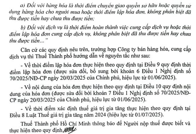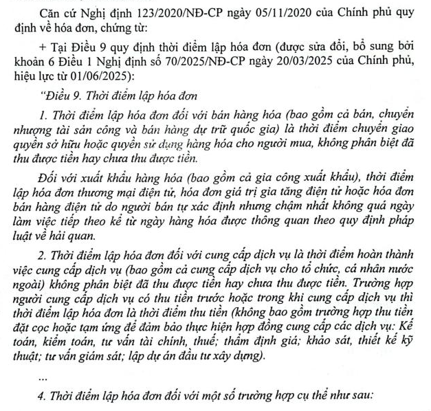 Công ty LARION - Mã số thuế 0303129210 Theo Điểm b Khoản 6 Điều 1 Nghị định 70/2025/NĐ-CP có hướng dẫn: "Thời điểm lập hóa đơn là thời điểm hoàn thành việc đối soát dữ liệu giữa các bên nhưng không chậm quá ngày 07 của tháng sau tháng phát sinh việc cung cấp dịch vụ". Và theo Điểm c Khoản 7 Điều 1 Nghị định 70/2025/NĐ-CP: "Trường hợp hóa đơn điện tử đã lập có thời điểm ký số trên hóa đơn khác thời điểm lập hóa đơn thì thời điểm ký số và thời điểm gửi cơ quan thuế cấp mã đối với hóa đơn có mã của cơ quan thuế hoặc thời điểm chuyển dữ liệu hóa đơn điện tử đến cơ quan thuế đối với hóa đơn điện tử không có mã của cơ quan thuế chậm nhất là ngày làm việc tiếp theo kể từ thời điểm lập hóa đơn" Công ty tôi thuộc trường hợp cung cấp dịch vụ cần có thời gian đối soát số liệu giữa doanh nghiệp cung cấp cấp dịch vụ và khách hàng hàng tháng. Xin Bộ Tài Chính tư vấn giúp: + Công ty tôi cung cấp khối lượng dịch vụ cho khách hàng trong tháng 07/2025, hai bên đã đối soát và hoàn thành công việc đối soát ngày 07/08/2025. Như vậy Công ty tôi lập hóa đơn vào ngày 07/08/2025, ký số và gởi cơ quan thuế cấp mã ngày 08/08/2025 có được xem là hợp lệ ? + Trên hóa đơn lập ngày 07/08/2025 và ký số gởi cơ quan thuế cấp mã ngày 08/08/2025 này. Công ty tôi ghi nội dung “Hoàn thành bàn giao dịch vụ tháng 07/2025 theo Biên bản đối soát tháng 7/2025 của Hợp đồng XYZ” và Công ty tôi ghi nhận hạch toán doanh thu, kê khai thuế GTGT trong kỳ tháng 07/2025 có được xem là hợp lệ (Công ty thuộc diện kê khai thuế GTGT hàng tháng) ? Hay là Công ty phải ghi nhận doanh thu, kê khai thuế GTGT trong kỳ tháng 08/2025 (?)