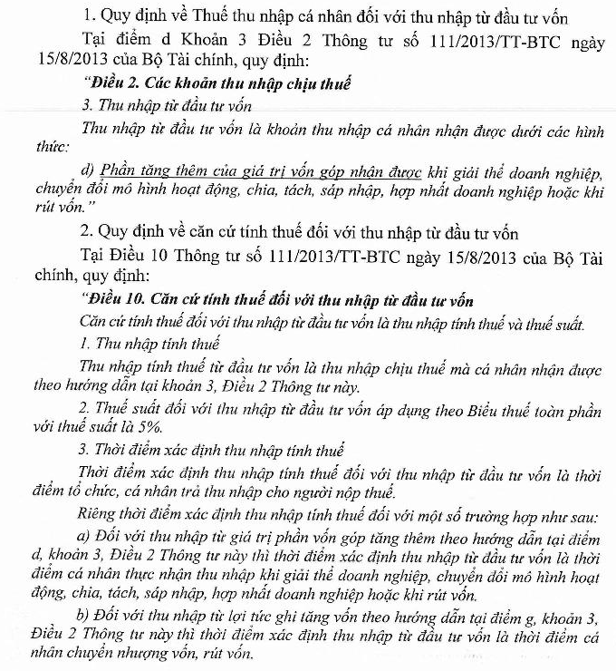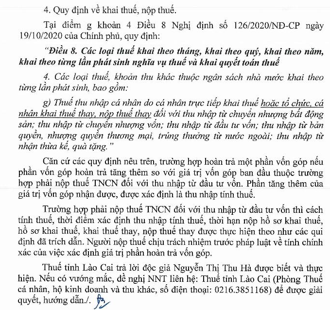 Kính gửi: Cục thuế. Tôi đang có vướng mắc như sau: Doanh nghiệp nơi tôi đang công tác là Công ty TNHH 2 thành viên trở lên đang hoạt động ổn định từ năm 2002 đến nay. Vào thời điểm tháng 9/2025 các thành viên góp vốn đề nghị công ty giảm vốn điều lệ để hoàn trả lại một phần vốn góp cho từng thành viên với tỷ lệ 45% số vốn góp. Số tiền ( Vốn góp) hoàn trả cho các thành không có chênh lệch so với giá trị vốn góp ban đầu. Vậy tôi muốn hỏi Quý cục khi công ty chúng tôi hoàn trả vốn góp cho các thành viên, thì số tiền các thành viên nhận được có phải nộp thuế thu nhập cá nhân không? Nếu phải nộp thuế thu nhập cá nhân thì kê khai thế nào? Nếu phải kê khai thuế thu nhập các nhân thi công ty có kê khai thay cho các cá nhân được không? Rất mong được sự hướng dẫn sớm từ Quý cục. Xin trân trọng cảm ơn./