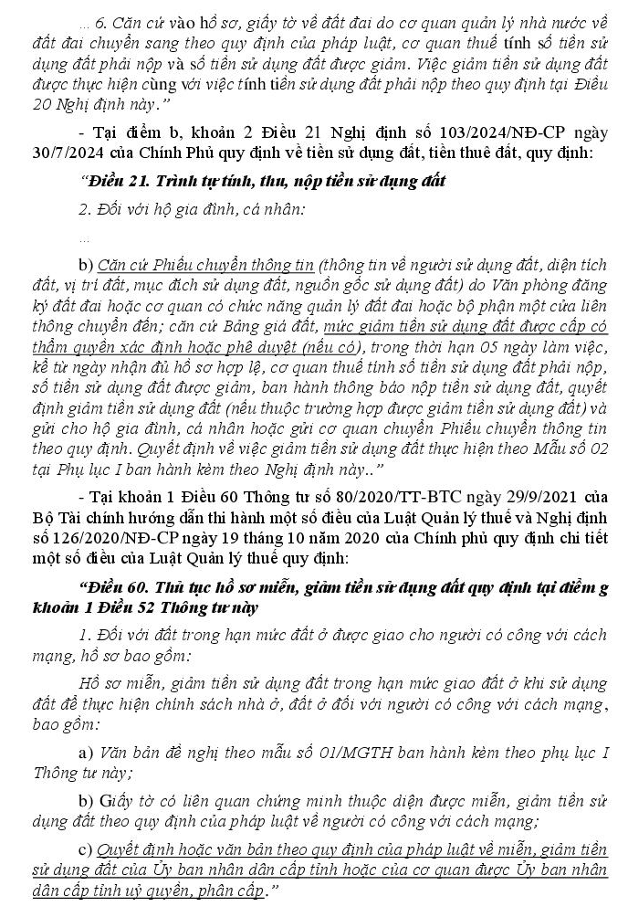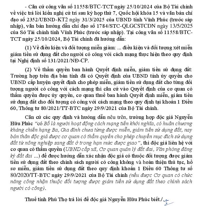 Bố tôi là người hoạt động cách mạng tiền khởi nghĩa, có huân chương kháng chiến hạng Ba, có tên trong lịch sử Đảng bộ Yên Bái. Gia đình tôi chưa từng được miễn, giảm tiền sử dụng đất. Nay tôi chuyển mục đích sử dụng đất từ nông nghiệp sang đất ở trong hạn mức được giao, được cấp phép.
