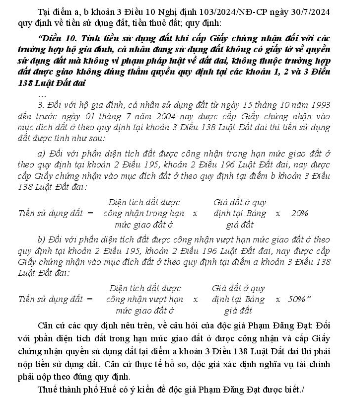 Theo khoản 3 Điều 10 Nghị định 103/2024/NĐ-CP và điểm a khoản 3 Điều 138 Luật Đất đai, tôi xin hỏi: Đối với phần diện tích đất trong hạn mức giao đất ở được công nhận và cấp Giấy chứng nhận quyền sử dụng đất thì có phải nộp tiền sử dụng đất không? Nếu có hoặc không, căn cứ cụ thể theo quy định nào?