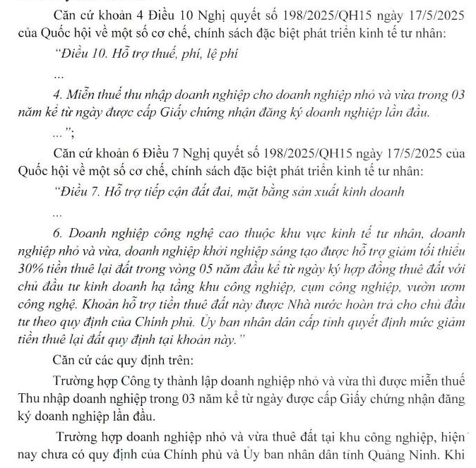 Kính gửi Bộ Tài Chính,theo Nghị Quyết 198/2025/QH15 ngày 17/5/2025 về chính sách hỗ trợ kinh tế tư nhân. Tôi có một số vướng mắc xin được giải đáp như sau: 1. Doanh nghiệp tôi là công ty TNHH MTV mới thành lập từ ngày 19/6/2025 do giám đốc đồng thời là chủ sở hữu đứng tên. Và Giám đốc cũng đang đứng tên đại diện pháp luật một Công ty TNHH MTV khác. Vậy Công ty mới thành lập này có được hưởng chính sách miễn thuế TNDN trong 3 năm đầu mới thành lập không? 2. Trường hợp 1 Doanh nghiệp vừa và nhỏ thành lập tháng 6/2025 thuê đất trong khu công nghiệp có đại diện pháp luật cũng đồng thời là đại diện pháp luật 1 doanh nghiệp khác. Trường hợp này Công ty mới thành lập thuê đất tại KCN được hưởng những chính sách thuế ưu đãi nào?