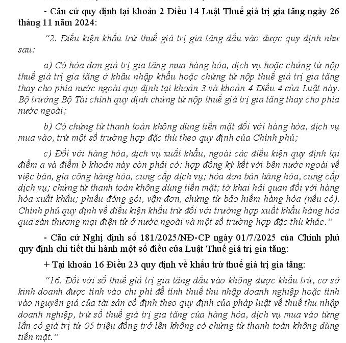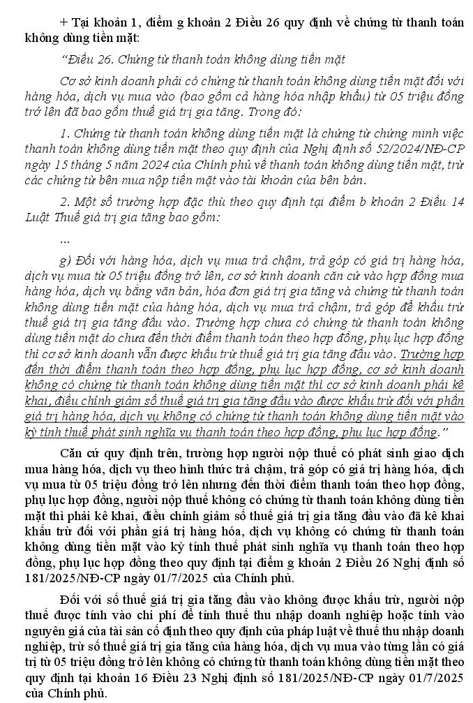 Kg Bộ Tài Chính, Tổng Cục Thuế. Hiện nay Doanh nghiệp chúng tôi đang rất băn khoăn về việc Cơ quan thuế địa phương hướng dẫn vấn đề kê khai thuế không dùng tiền mặt cụ thể: Đối với hàng hóa, dịch vụ mua trả chậm, trả góp có giá trị hàng hóa, dịch vụ mua từ 05 triệu đồng trở lên, cơ sở kinh doanh căn cứ vào hợp đồng mua hàng hóa, dịch vụ bằng văn bản, hóa đơn giá trị gia tăng và chứng từ thanh toán không dùng tiền mặt của hàng hóa, dịch vụ mua trả chậm, trả góp để khấu trừ thuế giá trị gia tăng đầu vào. Trường hợp chưa có chứng từ thanh toán không dùng tiền mặt do chưa đến thời điểm thanh toán theo hợp đồng, phụ lục hợp đồng thì cơ sở kinh doanh vẫn được khấu trừ thuế giá trị gia tăng đầu vào. Trường hợp đến thời điểm thanh toán theo hợp đồng, phụ lục hợp đồng, cơ sở kinh doanh không có chứng từ thanh toán không dùng tiền mặt thì cơ sở kinh doanh phải kê khai, điều chỉnh giảm số thuế giá trị gia tăng đầu vào được khấu trừ đối với phần giá trị hàng hóa, dịch vụ không có chứng từ thanh toán không dùng tiền mặt vào kỳ tính thuế phát sinh nghĩa vụ thanh toán theo hợp đồng, phụ lục hợp đồng.” * Vậy trường hợp sau thời hạn hợp đồng chúng tôi có chứng từ đầy đủ thì có được khấu trừ không? Có thì thời hạn là bao nhiêu ngày sau khi quá hạn. Nếu không được khấu trừ thì không hợp lý với 1 số trường hợp sau: Ví dụ hợp đồng điện nước, chúng tôi chỉ quá hạn có mấy ngày, khách hàng họ cũng không kiến nghị gì mà lại không được khấu trừ thì oan uổng quá. Có thể vào ngày cuối tuần, hoặc mất điện, hoặc có lý do khác. Theo CV Hướng dẫn của Thuế Ninh Bình và thuế Vĩnh Long thì chúng tôi phải bỏ không được kê khao. Vấn đề này đề nghị quý bộ nghiên cứu lại cho phù hợp với thực tiễn hoạt động của doanh nghiệp.
