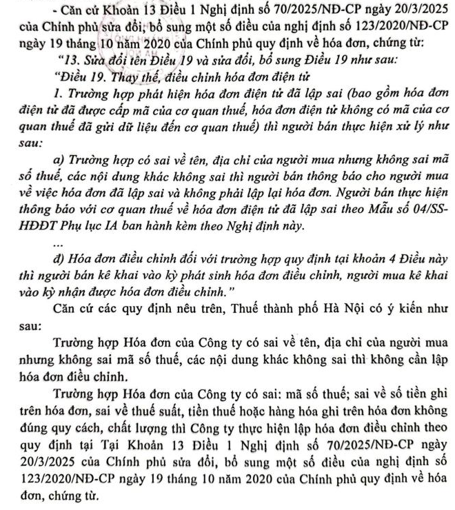 Kính gửi Bộ Tài chính. Công ty chúng tôi là nhà thầu trúng thầu cung cấp dịch vụ công ích cho các Quận Huyện theo Hợp đồng đã kí từ 1/1-31/12/2025, Khối lượng công việc thực hiện tháng 6 được Quận huyện kí hồ sơ nghiệm thu vào ngày 30/6/2025, Công ty xuất hóa đơn cho người mua hàng là Quận, huyện. Từ 1/7/2025 chấm dứt hoạt động của Quận huyện, UBND Thành phố có văn bản giao Trung tâm trực thuộc Sở thực hiện thanh toán phần KL đã thực hiện Tháng 6 cho Nhà thầu. Vậy Công ty chúng tôi có cần viết hóa đơn điều chỉnh tên người mua hàng, địa chỉ, mã số thuế từ Quận huyện sang Trung tâm (được giao trả tiền) không? Trường hợp phải viết hóa đơn điều chỉnh thì cần thực hiện thủ tục như thế nào?