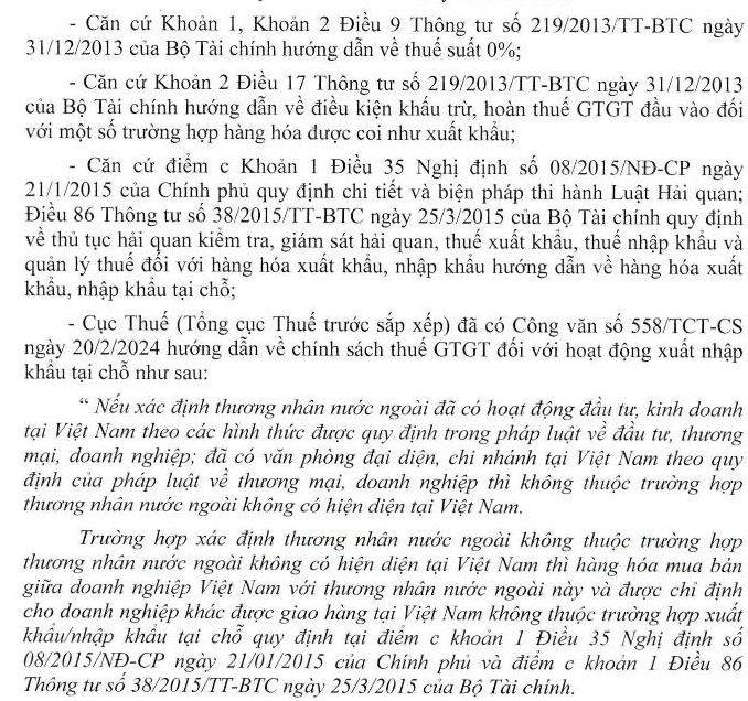 Kính gởi Bộ tài chính, Chúng tôi là doanh nghiệp FDI kinh doanh hàng phụ liệu may mặc hơn 15 năm tại Tp.Hồ Chí Minh, Đơn hàng của chúng tôi đa số do Thương nhân nước ngoài đặt hàng và chỉ định giao hàng cho nhà máy gia công của họ tại Việt Nam, nên chúng tôi đã làm tờ khai xuất khẩu tại chỗ loại hình B11 cho các đơn hàng này với thuế suất 0%, Và từ đầu năm 2023 chúng tôi bị vướng phải tình trạng không thể hoàn thuế GTGT cho tờ khai xuất khẩu tại chỗ do không xác minh được các Thương nhân đối tác nước ngoài này có hiện diện hay không hiện diện tại Việt Nam căn cứ theo điểm c khoản 1 điều 35 Nghị định 08/2015/NĐ-CP ngày 21/01/2015, do đó chúng tôi đã ngưng hồ sơ hoàn thuế GTGT đến nay chờ hướng dẫn; Đến Ngày 30 tháng 06 năm 2025, Chính phủ đã ban hành Nghị định 167/2025/NĐ-CP sửa đổi, bổ sung điểm c khoản 1 điều 35 Nghị định 08/2015/NĐ-CP trong đó có quy định chi tiết chính sách xuất nhập khẩu tại chỗ là đã Bỏ điều kiện không có hiện diện tại Việt Nam đối với Thương nhân nước ngoài, Nhưng đến tháng 9/2025, chúng tôi liên hệ nộp hồ sơ hoàn thuế GTGT cho Thuế khu vực quản lý đồng thời công văn gởi đến Cục Thuế thành phố Hồ Chí Minh thì nhận được công văn trả lời số 3999/TPHCM-NVDTPC ngày 24/10/2025 rằng họ căn cứ Công văn 558/BTC-CS ngày 20/2/2024 về chính sách thuế GTGT đối với hàng xuất nhập khẩu tại chỗ: Thương nhân nước ngoài hiện diện tại Việt Nam không thuộc trường hợp xuất nhập khẩu tại chỗ quy định điểm c khoản 1 điều 35 Nghị định 08/2015/NĐ-CP cũng như hồ sơ hoàn thuế GTGT của chúng tôi sẽ bị tạm loại trừ doanh thu đối với hàng xuất khẩu tại chỗ; Vậy chúng tôi kính mong nhận được Bộ Tài Chính phân tích trường hợp kinh doanh của chúng tôi phải áp dụng theo Nghị định/Thông tư nào ? có được xem là xuất khẩu tại chỗ không? và có được hoàn thuế GTGT tiếp tục cho các đơn hàng hiện tại và trong tương lai hay không?