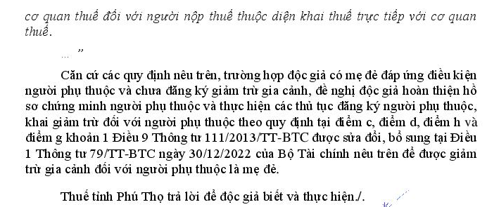 Tôi muốn làm giảm trừ gia cảnh cho mẹ ruột, tuy nhiên mẹ tôi sống ở quê, không cùng hộ khẩu và không sống chung với tôi. Mẫu 07/XN-NPT-TNCN (theo Thông tư 80/2021/TT-BTC) không có mục “không sống cùng”.