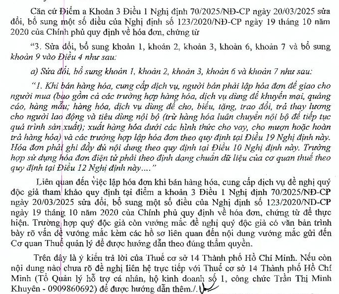 Kinh gửi Bộ phận hỗ trợ của Bộ tài chính, Em có câu hỏi muốn xin ý kiến của cơ quan có thẩm quyền ạ: Theo quy định tại Điểm d Khoản 3 Điều 13 Nghị định 123/2020/NĐ-CP có đề cập đại lý sẽ xuất hóa đơn cho người mua hàng, tuy nhiên trong tình huống nếu bên nhận đại lý bán hộ gói dịch vụ và bản chất gói dịch vụ vẫn do bên giao đại lý thực hiện cho khách hàng thì bên nhận đại lý có trách nhiệm xuất hóa đơn trực tiếp cho khách hàng không ạ? Theo em hiểu thì bên giao đại lý và bên cung cấp dịch vụ cho khách hàng nên sẽ phải chịu trách nhiệm xuất hóa đơn trực tiếp cho Khách hàng ạ. Mong Quý cơ quan hỗ trợ giải đáp thắc mắc trên của em ạ, em cảm ơn rất nhiều.