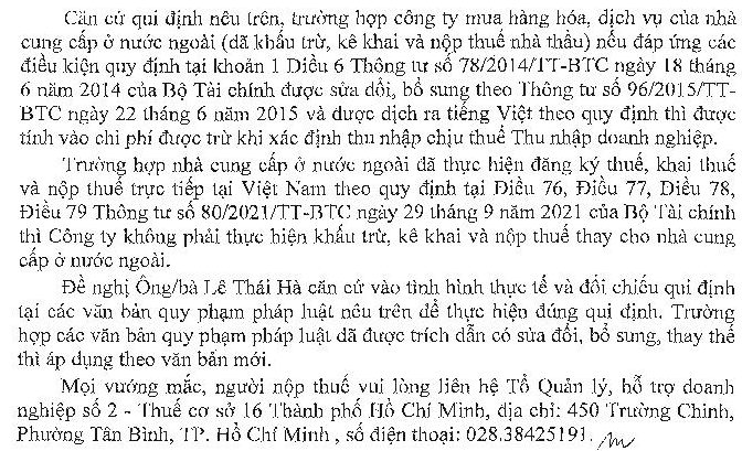 Kính gửi: Bộ Tài chính Tôi có vài câu hỏi liên quan đến thuế nhà thầu nước ngoài, mong Bộ Tài chính giải thích và hướng dẫn để tôi thực hiện đúng với quy định 1. Tôi có mua gói ChatGPT của OpenAI, các ứng dụng AI khác, thanh toán trực tuyến bằng thẻ Visa của công ty, nhưng không có hợp đồng kèm theo. Chứng từ điện tử gửi về bằng tiếng Anh, chỉ ghi tên công ty bằng chữ không dấu. Phía công ty có kê khai và nộp thuế nhà thầu đầy đủ. Vậy chúng tôi cần làm thủ tục gì để có thể hợp lý các chi phí từ những phát sinh trên? Với những chứng từ điện tử của NCC gửi bằng tiếng anh có được ghi chi phí hợp lý, hợp lệ không? 2. Về gói ChatGPT của OpenAI, trước 1/8/2025 họ không có mst ở VN nên chúng tôi vẫn kê khai thuế nhà thầu nộp thay Tuy nhiên từ 1/8/2025 OpenAI đã có mst nhà cung cấp nước ngoài ở Việt Nam, trên chứng từ cũng đã có thu thuế GTGT, chứng từ vẫn là chứng từ điện tử tiếng anh Chúng tôi muốn hỏi khi NCC nước ngoài đã có MST ở Việt Nam, có thu thuế VAT thể hiện trên chứng từ thì chúng tôi có cần thực hiện kê khai và nộp thuế nhà thầu nộp thay phần thuế TNDN nữa không?