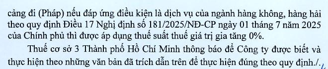 - Tuy nhiên, tại Nghị định 181/2025/NĐ-CP (có hiệu lực từ 01/07/2025), quy định nêu trên không còn được đề cập cụ thể. Vì vậy, hiện Công ty gặp khó khăn trong việc xác định thuế suất GTGT áp dụng cho phần giá trị dịch vụ do Công ty C thực hiện và phát sinh chi phí tại cảng đi ở nước ngoài.