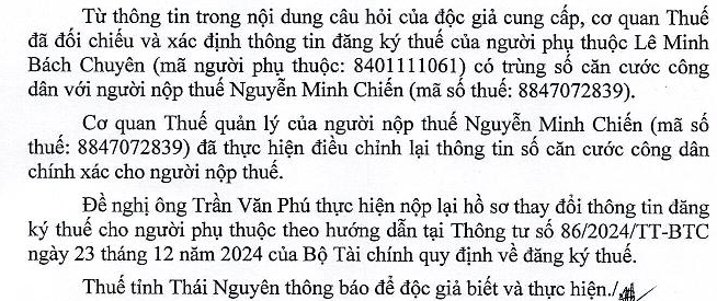Kính gửi Bộ Tài Chính, tôi có 1 vấn đề kiên quan đến lĩnh vực thuế như sau: Tôi đang thực hiện cập nhật căn cước công dân người phụ thuộc của cán bộ tại đơn vị. Có trường hợp người phụ thuộc có mst người phụ thuộc: 8401111061, tên người phụ thuộc: Lê Minh Bách Chuyên, số cccd người phụ thuộc: 019207001598 cấp ngày 24.08.2023 do Cục cảnh sát QLHC về TTXH cấp. Tuy nhiên, khi tôi thực hiện cập nhật thay đổi ở mẫu 20-DK-TH-TC thi kết quả trả về là số giấy tờ tùy thân của NNT trùng với số giấy tờ tùy thân của Nguyễn Minh Chiến, MST 8847072839. Và khi tôi thực hiện tra cứu số căn cước công dân số 019207001598 trên trang tra cứu người nộp thuế cũng ra cá nhân tên Nguyễn Minh Chiến. Vậy trong trường hợp này, tôi phải xử lý như nào để cập nhật được số định danh cho người phụ thuộc Lê Minh Bách Chuyên? 02/12/2025