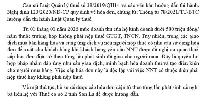 Kính gửi Bộ Tài chính, Tôi tên là Lê Thị Minh Hiền là hộ kinh doanh tại xã Mai Sơn tỉnh Sơn La hàng năm tôi luôn chấp hanh nộp thuế đây đủ vào NSNN, Thực hiện quy định của Luật quản lý thuế và các văn bản quy phạm pháp luật, từ tháng 1/2026 doanh thu bán hàng của quán hàng tôi khả năng dưới 500 Triệu đồng là doanh thu dưới ngưỡng quản lý thuế, vậy tôi có thuộc đối tượng được được cấp hóa đơn điện tử theo từng lần phát sinh (hóa đơn lẻ) của Cơ quan Thuế không?. Kính mong Bộ Tài chính giải đáp hướng dẫn để tôi thực hiện đúng quy định