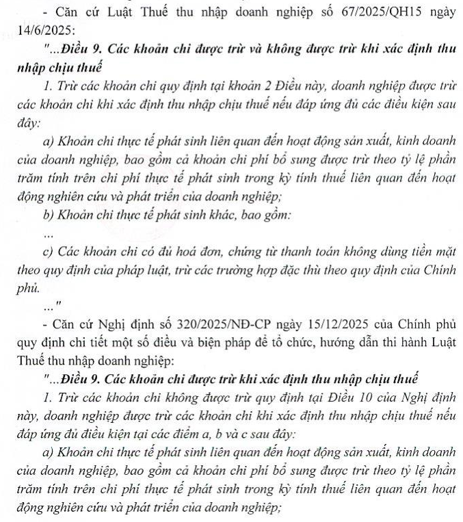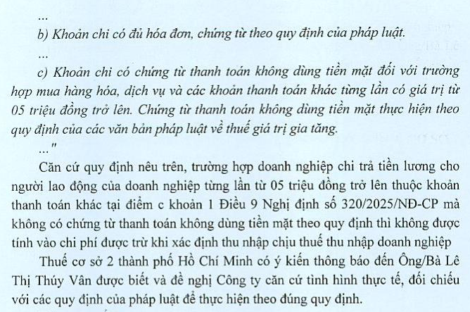 Căn cứ Nghị định 320/2025 ngày 15/12/2025 quy định và hướng dẫn một số điều của Luật thuế TNDN; tại tiết c, Khoản 1, Điều 9 của Nghị Định có nói: Khoản chi có chứng từ thanh toán không dùng tiền mặt đối với trường hợp mua hàng hóa, dịch vụ và các khoản thanh toán khác từng lần có giá trị từ 05 triệu đồng trở lên. Chứng từ thanh toán không dùng tiền mặt thực hiện theo quy định của các văn bản pháp luật về thuế giá trị gia tăng. Vậy xin hỏi, nếu doanh nghiệp chỉ trả lương cho người lao động bằng hình thức tiền mặt hoặc hiện vật (không trả lương theo hình thức thanh toán không dùng tiền mặt theo quy định) đối với từng người có mức lương trên 5 triệu đồng/người/lần chi trả thì có được đưa vào chi phí được trừ hay không?