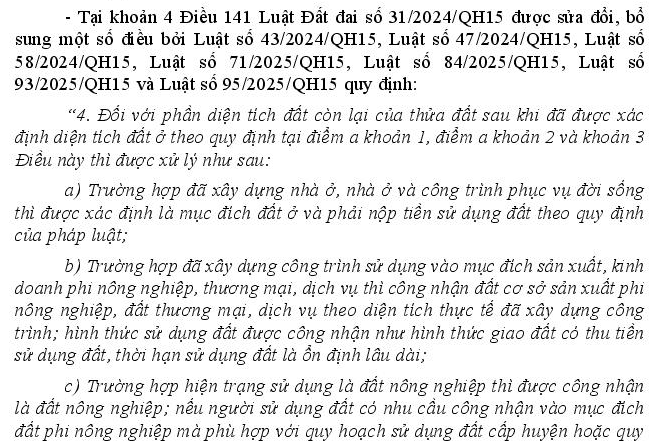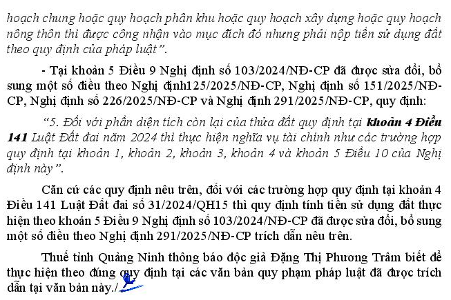 Khoản 4 Điều 141 Luật Đất đai quy định đối vơi phần diện tích còn lại của thửa đất có giấy tờ về quyền sử dụng đất theo quy định tại Điều 137 Luật Đất đai sau khi đã được xác định diện tích đất ở theo quy định mà được xác định mục đích đất ở theo quy định tại điểm a, c thì phải nộp tiền sử dụng đất theo quuy định. Tuy nhiên tại Nghị định 103/2024/NĐ-CP và Nghị định 291/2025/NĐ-CP không có quy định tính tiền sử dụng đất trong trường hợp này. Rất mong nhận được giải đáp của Bộ Tài chính.