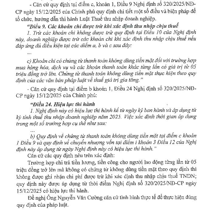 NĐ số 320/2025/NĐ-CP ngày 15/12/2025, tại điểm c, khoản 1, Điều 9 có ghi " Khoản chi có chứng từ thanh toán không dùng tiền mặt đối với trường hợp mua bán hàng hóa, dịch vụ và các khoản thanh toán khác từng lần có giá trị từ 5 triệu đồng trở lên. Chứng từ thanh toán không dùng tiền mặt thực hiện theo quy định của các văn bản pháp luật về thuế giá trị gia tăng". Vậy với tư cách Bộ Tài chính là cơ quan soạn thảo NĐ 320/2025/NĐ-CP, xin quý Bộ cho biết: Tiền lương, tiền công từng lần thanh toán từ 5 triệu đồng trở lên có phải chứng từ thanh toán không dùng tiền mặt được tính vào các khoản chi trừ khi xác định thu nhập chịu thuế? Trân trọng cảm ơn quý Bộ/