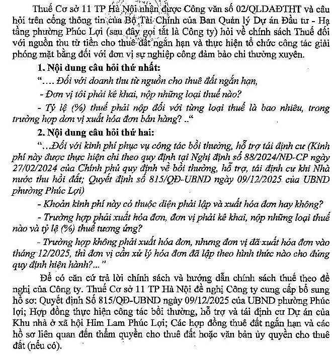 Kính gửi Cơ quan Thuế! Đơn vị tôi là Ban quản lý dự án đầu tư - hạ tầng - là đơn vị sự nghiệp công đảm bảo chi thường xuyên. Doanh thu đơn vị tôi từ nguồn cho thuê đất công ngắn hạn và tiền làm thuê công tác giải phóng mặt bằng cho 1 công ty thực hiện dự án xây nhà ở xã hội trên địa bàn. - Về nguồn thu từ cho thuê đất công ngắn hạn: khi phát sinh doanh thu, đơn vị tôi thực hiện xuất hoá đơn bán hàng trên tổng giá trị tiền thuê đất (đơn giá thuê đất là đơn giá không bao gồm thuế GTGT). - Về nguồn thu từ công ty thuê đơn vị tôi giải phóng mặt bằng: Nguồn thu này được CT UBND phường phê duyệt dự toán kinh phí, trong đó: kinh phí chi cho ban bồi thường GPMB, phòng Kinh tế hạ tầng để thực hiện chi phí tổ chức GPMB và đơn vị tôi (chi phí tổ chức thực hiện GPMB và chi lương cho cán bộ thực hiện nhiệm vụ). Hiện đơn vị tôi đã xuất hoá đơn bán hàng về số kinh phí đã được nhận. Tôi xin phép hỏi những nội dung sau: 1. Về nguồn thu tiền thuê đất ngắn hạn: đơn vị tôi phải kê khai và nộp những loại thuế nào, tỉ lệ % thuế phải nộp là bao nhiêu? 2. Về nguồn thu từ tiền thực hiện tổ chức công tác GPMB: việc đơn vị tôi xuất hoá đơn có đúng hay không, nếu đúng thì đơn vị tôi phải kê khai và nộp những loại thuế nào, tỉ lệ % thuế phải nộp là bao nhiêu; việc xuất hoá đơn cả phần chi phí cho ban bồi thường và phòng kinh tế hạ tầng có đúng hay không? nếu sai thì xử lí hoá đơn thế nào? Tôi xin trân trọng cảm ơn!