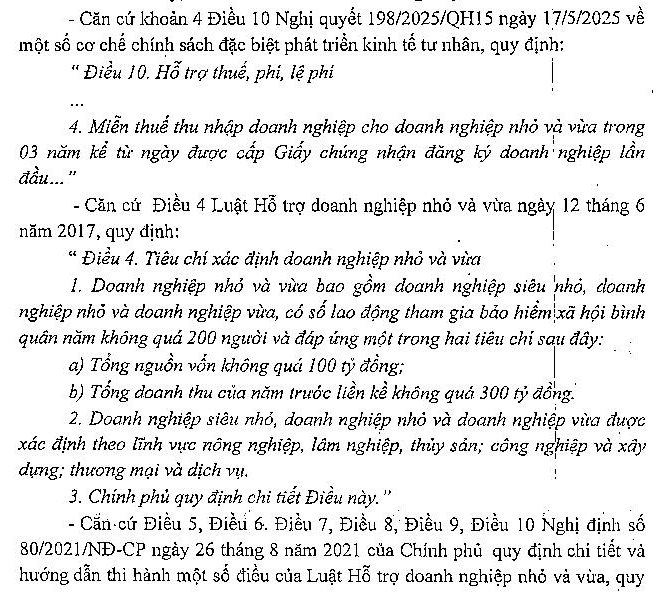 Kính chào Tổng cục thuế - Bộ tài chính cho tôi gửi lời chào và lời chúc sức khoẻ tới toàn thế cán bộ công chức thuế và cán bộ phụ trách hỗ trợ! Theo Nghị Quyết 198/2025 có hiệu lực 17/5/2025. Doanh nghiệp tôi thành lập 26/04/2025 thì có áp dụng được miễn thuế TNDN 3 năm đầu không? Căn cứ theo khoản 4 điều 10 NQ 198/2025 4. Miễn thuế thu nhập doanh nghiệp cho doanh nghiệp nhỏ và vừa trong 03 năm kể từ ngày được cấp Giấy chứng nhận đăng ký doanh nghiệp lần đầu. Mong nhận được phúc đáp tích cực nhất từ Tổng cục thuế Trân trọn cảm one