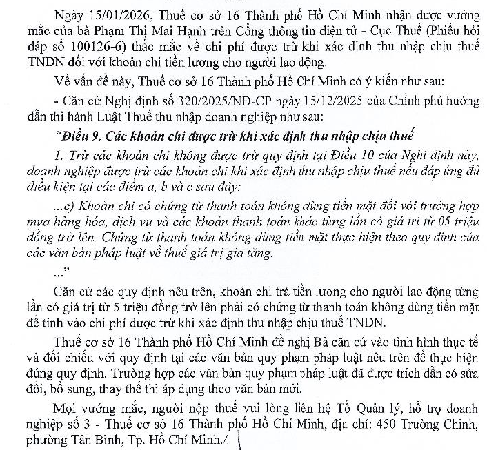 Căn cứ Nghị định 320/2025 ngày 15/12/2025 quy định và hướng dẫn một số điều của Luật thuế TNDN; tại tiết c, Khoản 1, Điều 9 của Nghị Định có nói: Khoản chi có chứng từ thanh toán không dùng tiền mặt đối với trường hợp mua hàng hóa, dịch vụ và các khoản thanh toán khác từng lần có giá trị từ 05 triệu đồng trở lên. VẬY cho tôi hỏi từ TỪNG LẦN có giá trị 5tr đ trở lên có nghĩa là MỖI LẦN CHI LƯƠNG DƯỚI 5tr thì KHÔNG CÀN PHẢI CHUYỂN KHOẢN. VD:. Lương ông A 7tr. ứng trước 4tr thì được nhận tiền mặt, 3tr còn lại nhận đúng kỳ chi lương cũng ĐƯỢC NHẬN TIỀN MẶT do TỪNG LẦN chuyển đều dưới 5tr. XIn giải thích rõ cum từ " TỪNG LẦN ". Hiện các DN đều cho người lao động ứng trước 1 phần lương.