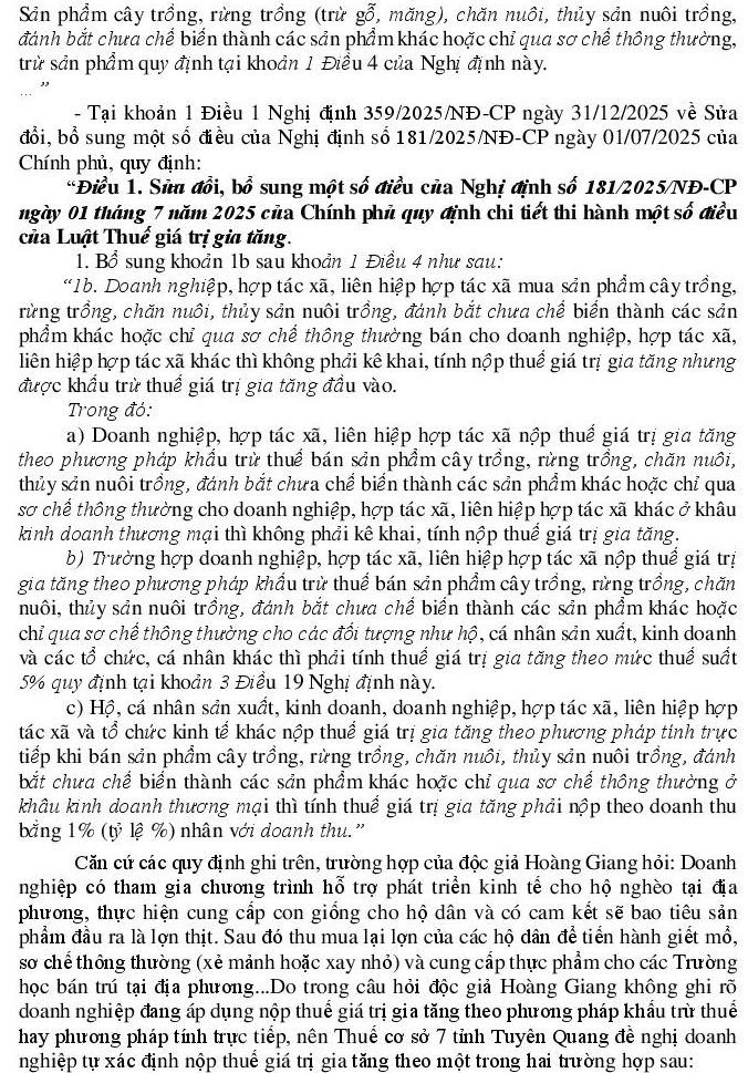 Kính gửi BTC, tôi có câu hỏi liên quan tới NĐ 359/2025/NĐ-CP: DN tôi có tham gia các dự án của địa phương về hỗ trợ cung cấp con giống cho bà con nông dân thuộc diện hộ nghèo vùng khó khăn để phát triển kinh tế cụ thể là lợn giống và có cam kết sẽ bao tiêu sản phẩm đầu ra là lợn thịt giúp bà con. Vậy khi DN tôi mua lại lợn của bà con trong trường hợp này về để giết mổ sơ chế thông thường (chỉ xẻ mảnh hoặc say nhỏ) để cung cấp thực phẩm cho các trường học bán trú tại địa phương Vậy theo nghị định 359/2025/NĐ-CP thì mặt thịt lợn DN đã qua sơ chế qua là áp dụng theo mục a là không kê khai tính nộp thuế hay mục b là chịu thuế suất 5% của khoản 1b được bổ sung theo nghị định 359/2025/NĐ-CP về chi tiết thi hành luật thuế GTGT. Xin trân trọng cảm ơn.