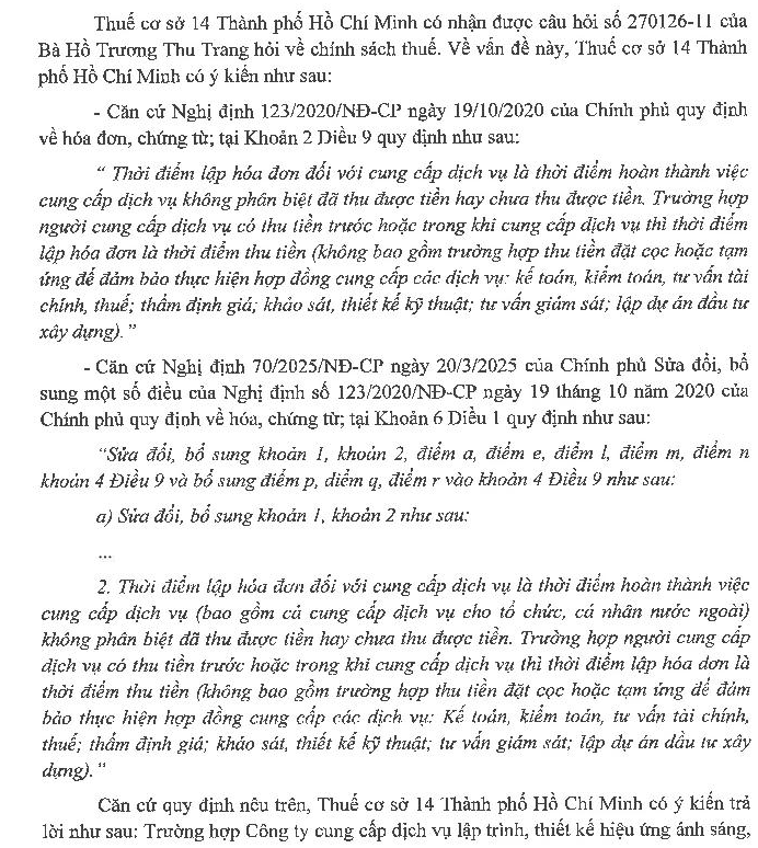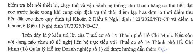 Kính gửi Bộ Tài Chính, Công ty chúng tôi có ký hợp đồng cung cấp dịch vụ lập trình, thiết kế hiệu ứng chiếu sáng, kiểm tra kết nối thiết bị, chạy thử và hướng dẫn vận hành hệ thống cho khách hàng. Theo hợp đồng, khách hàng thanh toán một khoản tiền ngay sau khi ký hợp đồng (ghi là tiền đặt cọc/tạm ứng), sau đó đơn vị chúng tôi mới triển khai thực hiện dịch vụ và hoàn thành, bàn giao theo tiến độ. Để thực hiện đúng quy định về hóa đơn, chứng từ theo Nghị định 123/2020/NĐ-CP và Thông tư 78/2021/TT-BTC, đơn vị chúng tôi kính đề nghị Quý Cơ quan hướng dẫn rõ: 1. Khoản tiền nhận ngay sau khi ký hợp đồng nêu trên có được xác định là tiền đặt cọc bảo đảm thực hiện hợp đồng và chưa phải lập hóa đơn tại thời điểm nhận tiền hay không? 2. Trường hợp phải lập hóa đơn, thời điểm lập hóa đơn là thời điểm nhận tiền hay thời điểm hoàn thành từng giai đoạn dịch vụ? Đơn vị chúng tôi kính mong nhận được ý kiến hướng dẫn của Bộ để có cơ sở thực hiện đúng quy định pháp luật về thuế. Xin trân trọng cảm ơn!