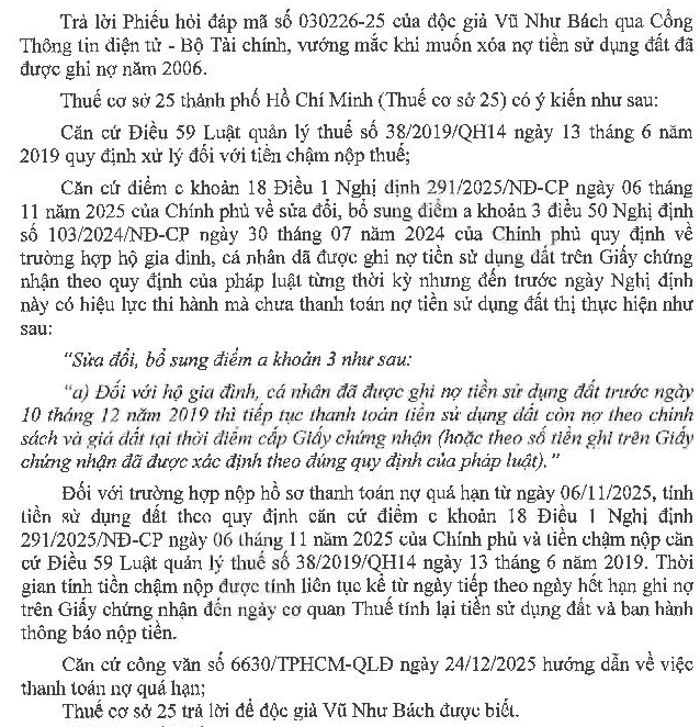 Tôi xin hỏi: Khi xóa nợ tiền sử dụng đất đã được ghi nợ từ năm 2006, gia đình tôi chỉ phải nộp số tiền 5 triệu đồng theo Giấy chứng nhận hay phải xác định lại tiền sử dụng đất theo bảng giá đất hiện hành?