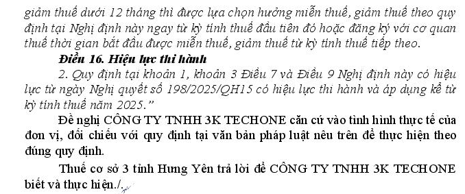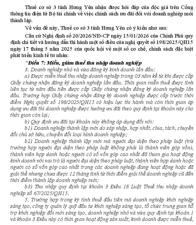 Kính gửi Bộ Tài chính. Công ty của chúng tôi thành lập vào ngày 24/12/2024, thuộc đối tượng doanh nghiệp vừa và nhỏ được miễn thuế 03 năm đầu theo khoản 3 Điều 7 NĐ20/2026/NĐ-CP của Chính phủ ban hành ngày 15/01/2026. Căn cứ theo khoản 5 Điều 7 của Nghị định này "Trường hợp trong kỳ tính thuế đầu tiên mà doanh nghiệp khởi nghiệp sáng tạo, công ty quản lý quỹ đầu tư khởi nghiệp sáng tạo, tổ chức trung gian hỗ trợ khởi nghiệp đổi mới sáng tạo, doanh nghiệp nhỏ và vừa quy định tại khoản 1 và khoản 3 Điều này có thời gian hoạt động sản xuất, kinh doanh được miễn thuế, giảm thuế dưới 12 tháng thì được lựa chọn hưởng miễn thuế, giảm thuế theo quy định tại Nghị định này ngay từ kỳ tính thuế đầu tiên đó hoặc đăng ký với cơ quan thuế thời gian bắt đầu được miễn thuế, giảm thuế từ kỳ tính thuế tiếp theo". Vậy với quy định như trên thì Công ty chúng tôi có được lựa chọn bỏ qua kỳ miễn thuế năm 2024 và bắt đầu tính miễn thuế TNDN 03 năm 2025, 2026 và 2027 không. Ngoài ra, chúng tôi có cần phải nộp công văn xin chọn kỳ miễn thuế từ năm 2025 hay không. Kính mong Bộ Tài chính giải đáp thắc mắc của chúng tôi. Xin chân thành cảm ơn!