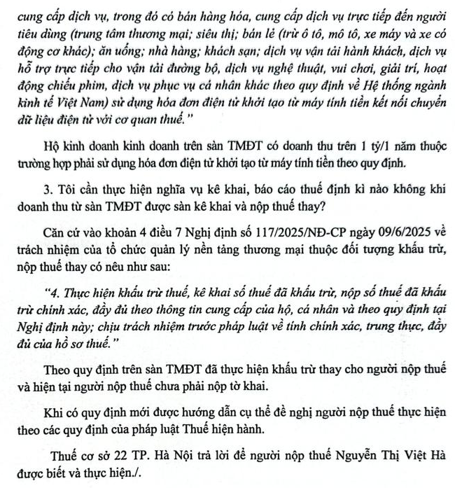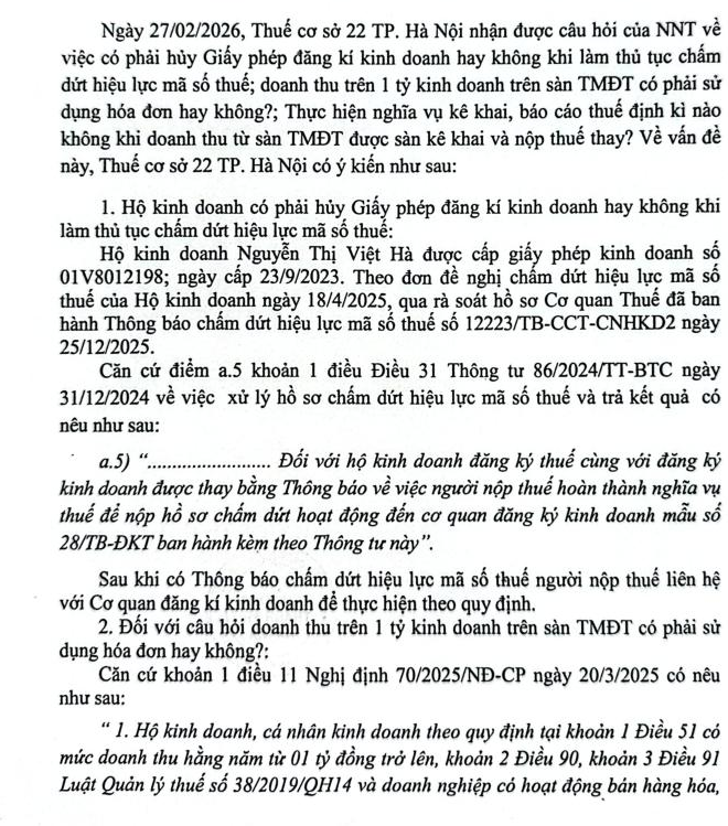 Kính gửi Cơ quan Thuế, Tôi tên là: Nguyễn Thị Việt Hà Số CCCD: 001303023133 Tôi xin trình bày trường hợp của mình và mong được hướng dẫn cụ thể: Tôi đã đăng ký kinh doanh từ năm 2023 và được cấp mã số thuế có đuôi 001 và 888. Hiện tại tôi chỉ kinh doanh bán hàng trên các sàn thương mại điện tử và các sàn đã thực hiện kê khai, khấu trừ và nộp thuế theo quy định. Tôi đã thực hiện thủ tục chấm dứt hiệu lực mã số thuế đuôi 001. Tuy nhiên hiện tôi đang gặp vướng mắc như sau: Về giấy phép đăng ký kinh doanh: Phòng Kinh tế hướng dẫn tôi chỉ cần thay đổi thông tin, không cần hủy giấy phép. Tuy nhiên cán bộ thuế tại địa phương lại hướng dẫn tôi cần hủy giấy phép đăng ký kinh doanh. → Tôi kính mong cơ quan thuế hướng dẫn rõ trong trường hợp của tôi có bắt buộc phải chấm dứt giấy phép đăng ký kinh doanh hay không. Trường hợp tôi vẫn giữ giấy phép đăng ký kinh doanh: Tôi cần thực hiện nghĩa vụ kê khai, báo cáo thuế định kỳ nào không, khi doanh thu từ sàn thương mại điện tử đã được sàn kê khai và nộp thuế thay? Về hóa đơn điện tử: Tôi thuộc nhóm doanh thu trên 1 tỷ đồng/năm nên theo quy định cần sử dụng hóa đơn điện tử. Tuy nhiên tôi được cán bộ thuế thông tin hiện chưa có hướng dẫn cụ thể đối với hoạt động kinh doanh qua sàn thương mại điện tử. → Nếu hiện tại tôi hủy giấy phép kinh doanh, khi có hướng dẫn tôi có cần đăng kí hộ kinh doanh lại không? vì cá nhân kinh doanh đuôi 888 chưa xuất được hóa đơn Rất mong nhận được phản hồi và hướng dẫn từ Quý cơ quan để tôi thực hiện đúng quy định pháp luật.