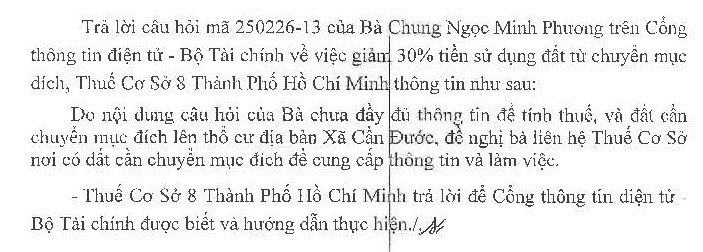 Kính gửi : Quý cơ quan Năm 2011 mẹ tôi nhận di sản thừa kế từ bố tôi đứng chủ quyền sử dụng đất :: 1.129 m2 ( đất thổ cư + ao ) do UBND huyện cần đước cấp .Sau đó đơn vị đo đạt khi đo vẽ bản đồ địa chính trước ngày 01/07/2014 đã tự đo đạt tách thành 2 thửa riêng : + Thửa đất ở tại đô thị : 733.8m2 + thửa đất nuôi trồng thủy sản có điện tích : 182.5m2 Năm 2025 tôi nhận thừa kế từ mẹ tôi 2 thửa đất nói trên và xin chuyển mục đích sang đất ở đối vời thửa đất nuôi trồng thủy sản 182.5m2 .Ngày 20/01/2026 tôi được UBND xã Cần Đước cho phép chuyển mục đích sang đất ở diện tích 182.5 m2. ( Hạn mức tại địa phương 200 m2) Căn cứ điểm c khoản 2 điều 10 Nghị quyết số 254/2025/QH15 ngày 31/12/25 và nghị định 50/2026 Ngày 31/01/26 thì tôi nộp 30% tiền sử dụng đất đối với thửa đất đầu tiên xin chuyển mục đích mà không phụ thuộc vào diện tích đất ở tôi đang sở hửu tại địa phương đó . Kính mong quý cơ quan hướng dẩn giúp Trong khi chờ đợi sự hướng dẩn của quý cơ quan tôi chân thành cám ơn .