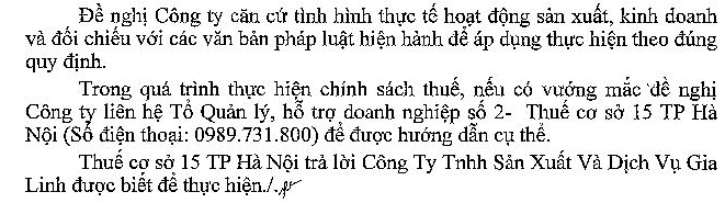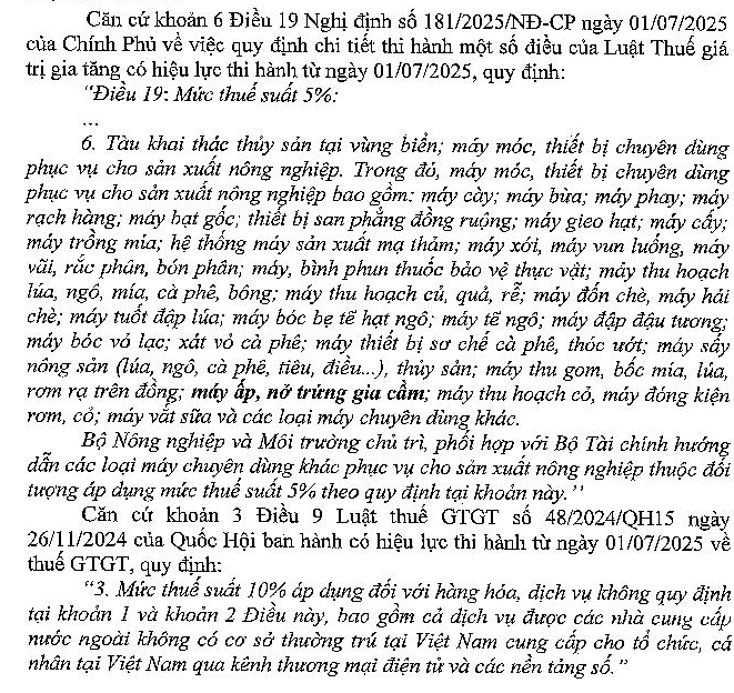 Công ty TNHH Sản xuất và Dịch vụ Gia Linh có MST 0101873635 là doanh nghiệp do Thuế cơ sở 15 thành phố Hà Nội trực tiếp quản lý thuế. Trước đó, Công ty đã có Công văn gửi Bộ Tài chính đề nghị hướng dẫn về thuế suất thuế giá trị gia tăng (GTGT) đối với máy móc, thiết bị chuyên dùng phục vụ trong chăn nuôi. Ngày 14/8/2025, Bộ Tài chính (Cục Quản lý, giám sát chính sách thuế, phí và lệ phí) đã có Công văn số 4190/CST-GTGT trả lời, hướng dẫn doanh nghiệp liên hệ Bộ Nông nghiệp và Môi trường để xác định các loại máy móc, thiết bị chuyên dùng phục vụ sản xuất nông nghiệp thuộc đối tượng áp dụng thuế suất GTGT 5% theo quy định. Thực hiện theo hướng dẫn của Bộ Tài chính, Công ty đã có văn bản gửi Bộ Nông nghiệp và Môi trường và được Cục Chăn nuôi và Thú y – Bộ Nông nghiệp và Môi trường xác nhận tại Công văn số 3412/CNTY-KHCNMT ngày 11/11/2025, theo đó các máy móc, thiết bị, phụ kiện (chi tiết tại Phụ lục kèm theo) đều là loại chuyên dùng trong chăn nuôi gia súc, gia cầm, thuộc lĩnh vực nông nghiệp. Công ty TNHH Sản xuất và Dịch vụ Gia Linh kính đề nghị Thuế cơ sở 15 thành phố Hà Nội xem xét, hướng dẫn việc áp dụng thuế suất thuế GTGT 5% đối với các mặt hàng máy móc, thiết bị chuyên dùng phục vụ trong chăn nuôi nêu tại Phụ lục kèm theo, để Công ty thực hiện việc xuất hóa đơn, kê khai và nộp thuế GTGT đúng quy định của pháp luật.