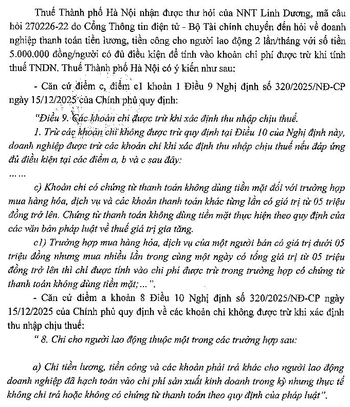 Kính gửi: Bộ Tài chính. Căn cứ Luật thuế TNDN số 67/2025/QH15; Nghi định số 320/2025/NĐ-CP, Tôi vị xin trao đổi và xin hỏi Quý Bộ Tài chính nội dung sau: Doanh nghiệp tôi có 10 lao động, Từ tháng 12/2025 doanh nghiệp tôi trả tiền lương, tiền công cho người lao động theo hình thức 02 lần/tháng cụ thể: - Lần 1 vào ngày 15 hàng tháng đơn vị tôi chi trả theo danh sách gồm 10 người lao động mỗi người 3.000.000 đ với tổng số tiền: 3.000.000 đ/người x 10 người = 30.000.000 đ bằng 01 phiếu chi tiền mặt. - Lần 2 vào ngày cuối tháng đơn vị tôi chi trả phần còn lại cho 10 người lao động trên (trong danh sách có người 2.000.000 đ, có người 5.000.000 đ) với tổng số tiền là 40.000.000 đ bằng 01 phiếu chi tiền mặt. ( Việc chi trả nêu trên được thực hiện theo thỏa thuận 2 bên, giữa Doanh nghiệp với mỗi người lao động, các chứng từ thanh toán gồm: Bảng thanh toán lương, bảng chấm công, phiếu chi tiền lương cho người lao động). Xin hỏi Quý Cơ quan Bộ Tài chính với Lần 1 và Lần 2 đơn vị tôi chi trả như vậy có đủ điều kiện để tính vào khoản chi phí được trừ khi tính thuế TNDN. Vậy kính mong Quý Cơ quan Bộ Tài chính hướng dẫn chính sách thuế cho đơn vị để đơn vị tôi thực hiện tốt nghĩa vụ thuế. Xin trân trọng cảm ơn Quý Cơ quan.