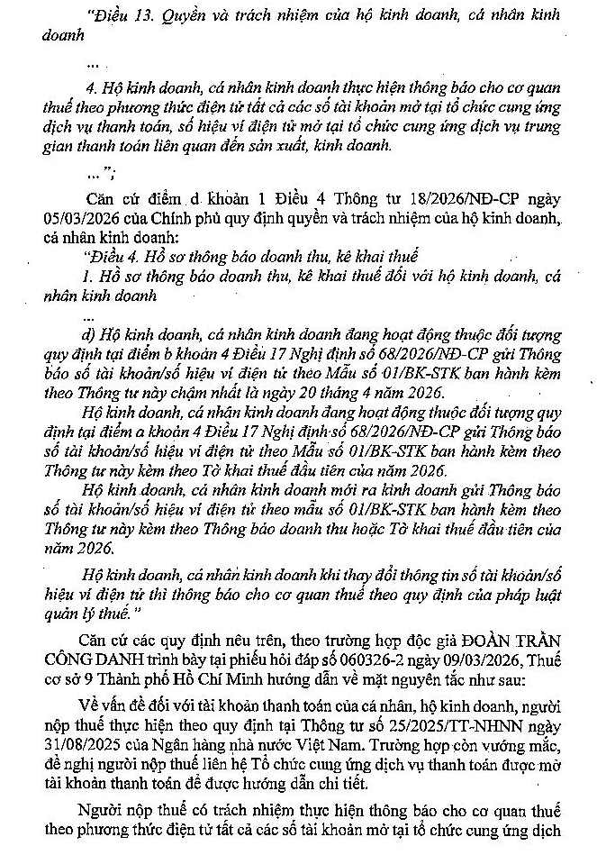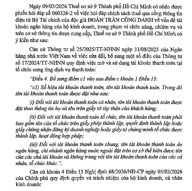 Xin hỏi từ ngày 01/3/2026, hộ kinh doanh có bắt buộc phải sử dụng tài khoản có tên "Hộ Kinh doanh X" không? Hay chỉ cần sử dụng tài khoản cá nhân (mang tên "Nguyễn Văn A") với điều kiện tài khoản này chỉ dùng cho mục đích kinh doanh, không sử dụng cho mục đích cá nhân. Trong trường hợp hộ kinh doanh bắt buộc phải sử dụng tài khoản có tên "Hộ Kinh doanh X". Xin được hỏi, ngoài tài khoản VNĐ có tên "Hộ Kinh doanh X", tôi có thể sử dụng tài khoản ngoại tệ mang tên "Nguyễn Văn A" không? Vì Hộ kinh doanh của tôi, có nhận hợp đồng gia công sản xuất cho công ty nước ngoài, và bên phía đối tác yêu cầu tài khoản ngân hàng phải có tên trùng với tên trên hộ chiếu. Ngoài ra, tôi đang có dự tính nhận thêm các công việc trên sàn UpWorks, sàn này trả tiền thông qua PayPal, và họ cũng yêu cầu tài khoản ngân hàng có tên trùng khớp với tên trên hộ chiếu.