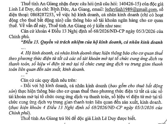 Theo tôi được biết là tại khoản 4 Điều 13 Nghị định 68/2026/NĐ-CP và điểm d khoản 1 Điều 4 Thông tư số 18/2026/TT-BTC có quy định hộ kinh doanh, cá nhân kinh doanh phải thông báo số tài khoản ngân hàng có liên quan đến hoạt động sản xuất kinh doanh (đối tượng sử dụng tờ khai mẫu tờ khai 01/CNKD) cho cơ quan thuế. Tuy nhiên, người quen của tôi chỉ có hoạt động cho thuê bất động sản (đối tượng sử dụng mẫu tờ khai 01/BĐS) thì có cần phải thông báo số tài khoản ngân hàng (mẫu 01/BK-STK) cho cơ quan thuế quản lý bất động sản cho thuê của người này hay không? Kính mong Bộ tài chính phản hồi vướng mắc. Xin cảm ơn!